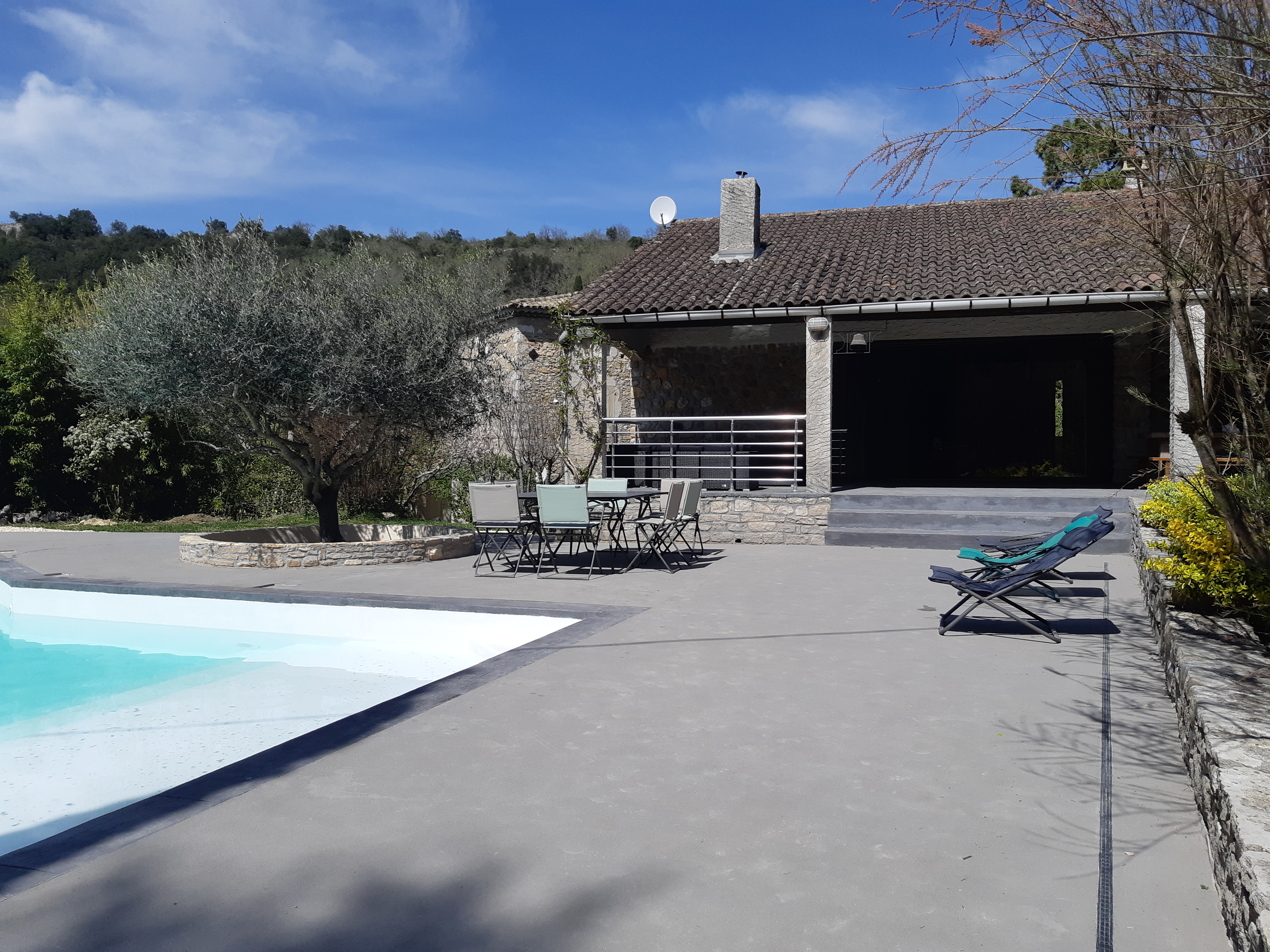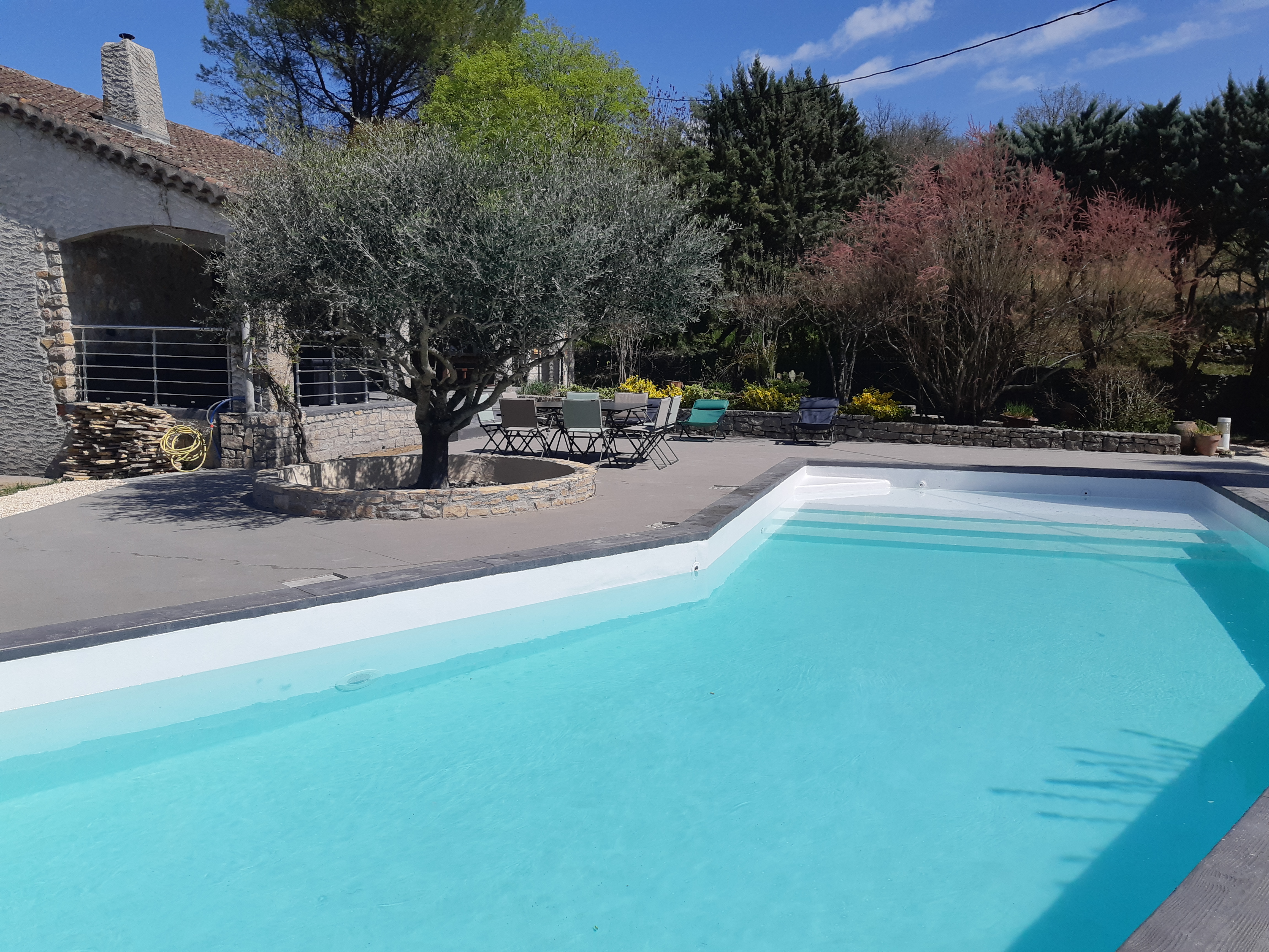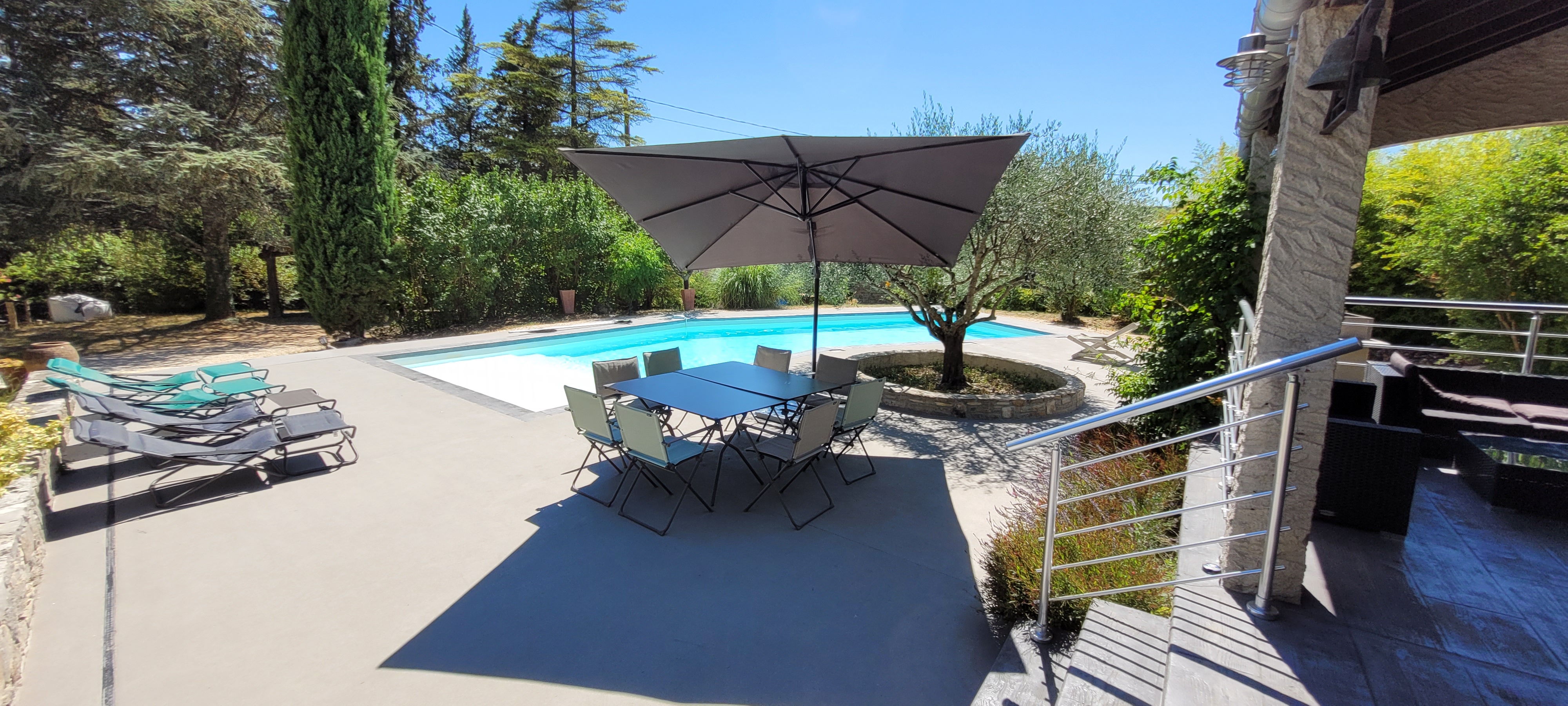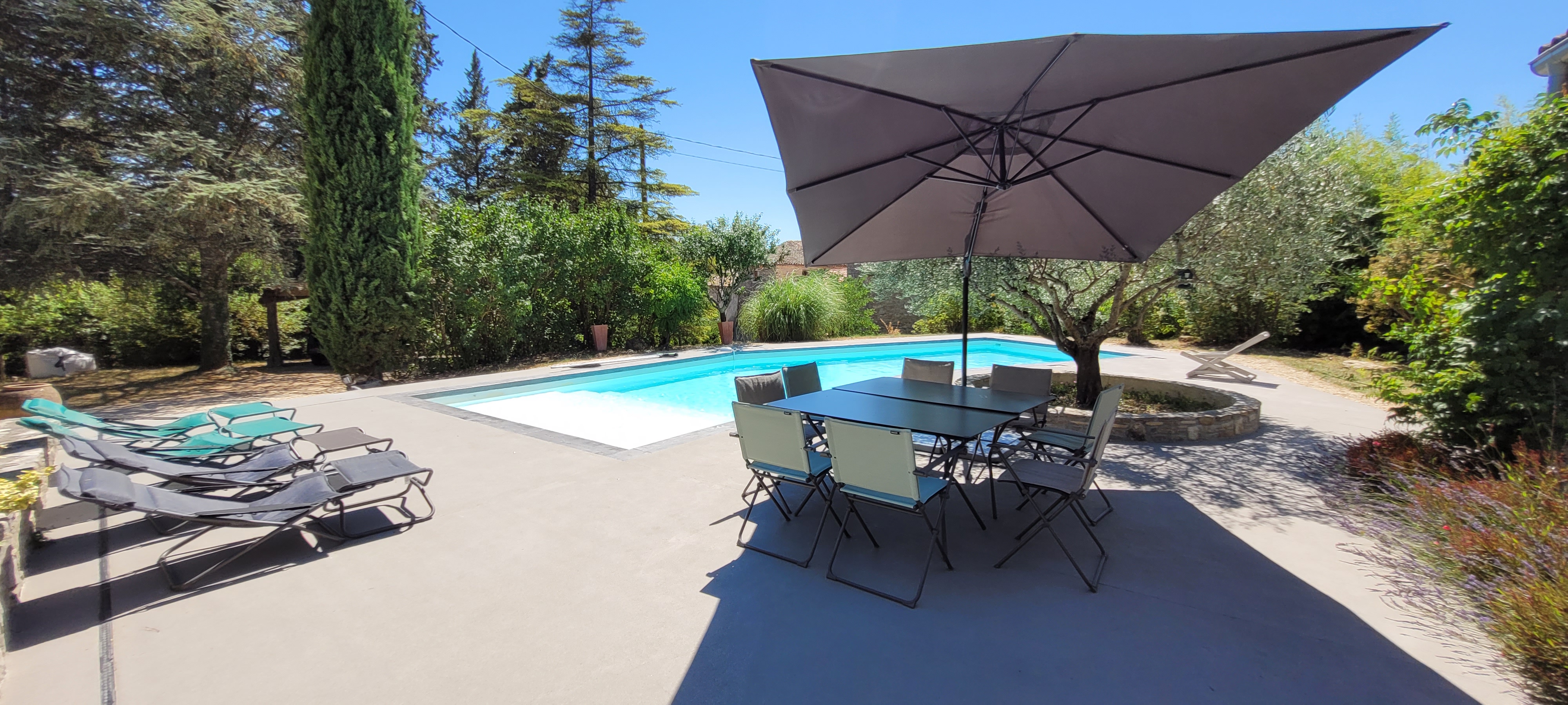 Une terrasse couverte de 35m² comprenant: -un salon de jardin de 10 places -un table et 2 bancs pour 10 convives sous un ventilateur pour recevoir vos amis. Une grande piscine de 4,5m X 12m avec un traitement au sel pour un maximum de confort. Une alarme de piscine conforme à la réglementation. Une magnifique plage de piscine de 110m² -avec 2 tables et 8 chaises pour vos petits déjeuners ou repas en soirée -5 transats. Un barbecue. Un terrain de pétanque avec les boules à disposition. Un abris à voiture pour 2 véhicules. Un étendoir à linge et un composteur.