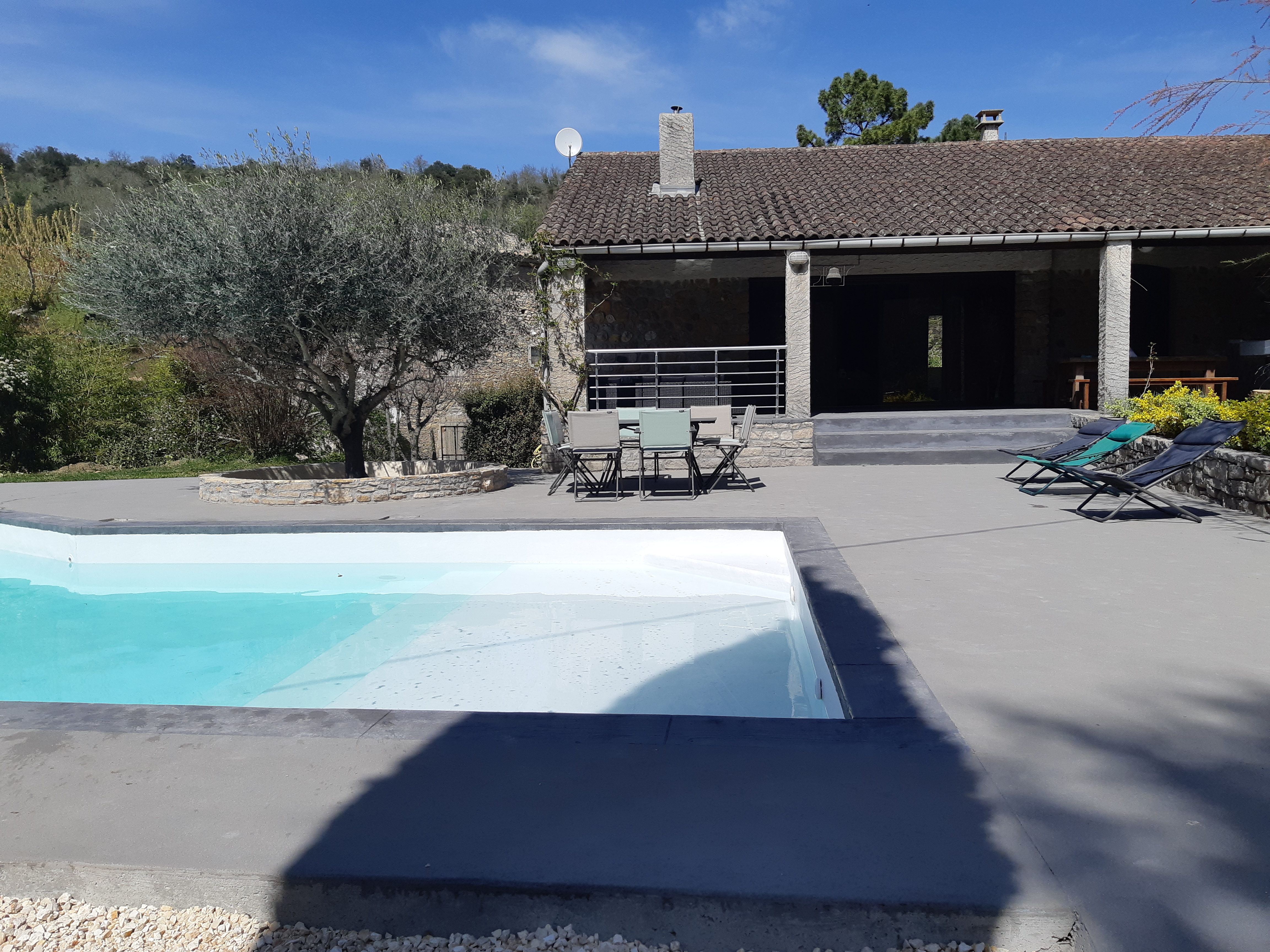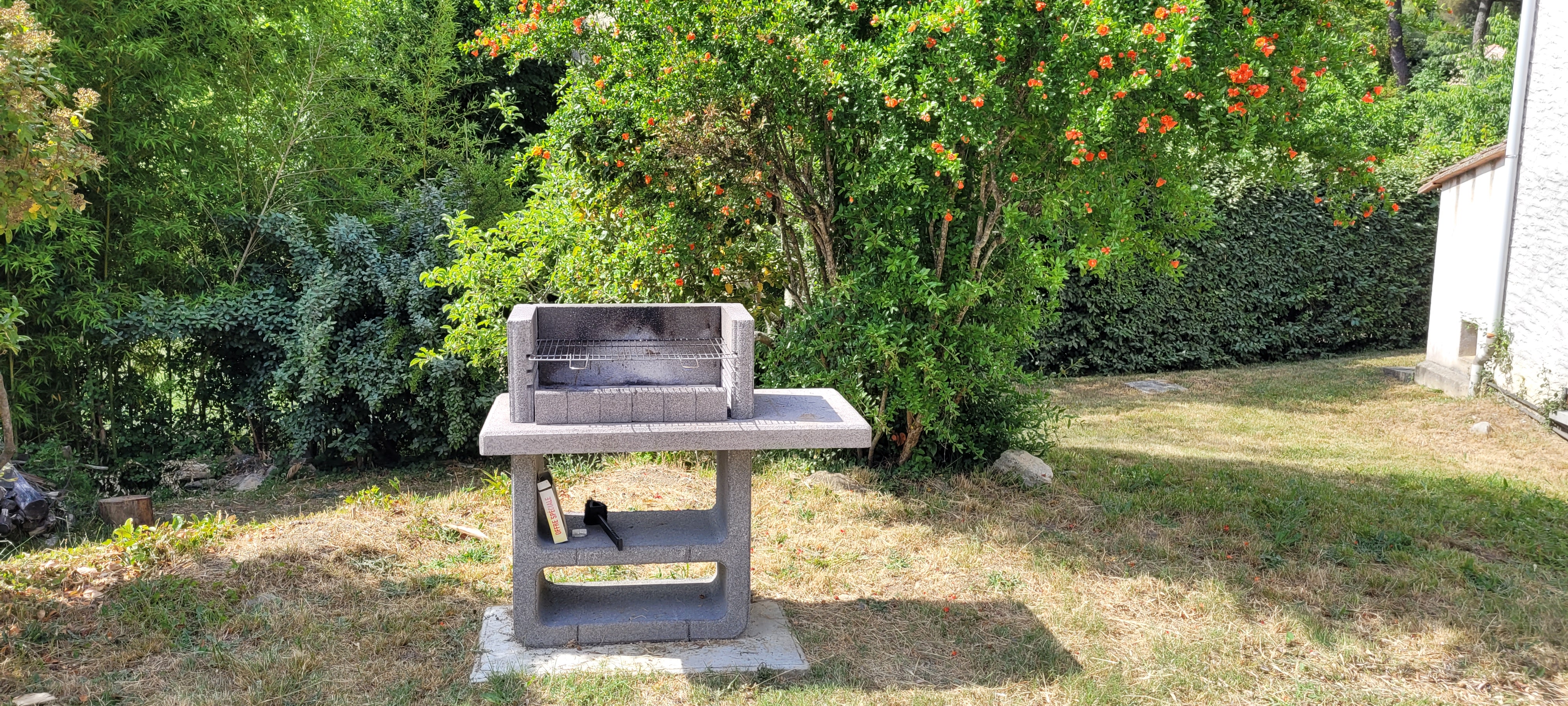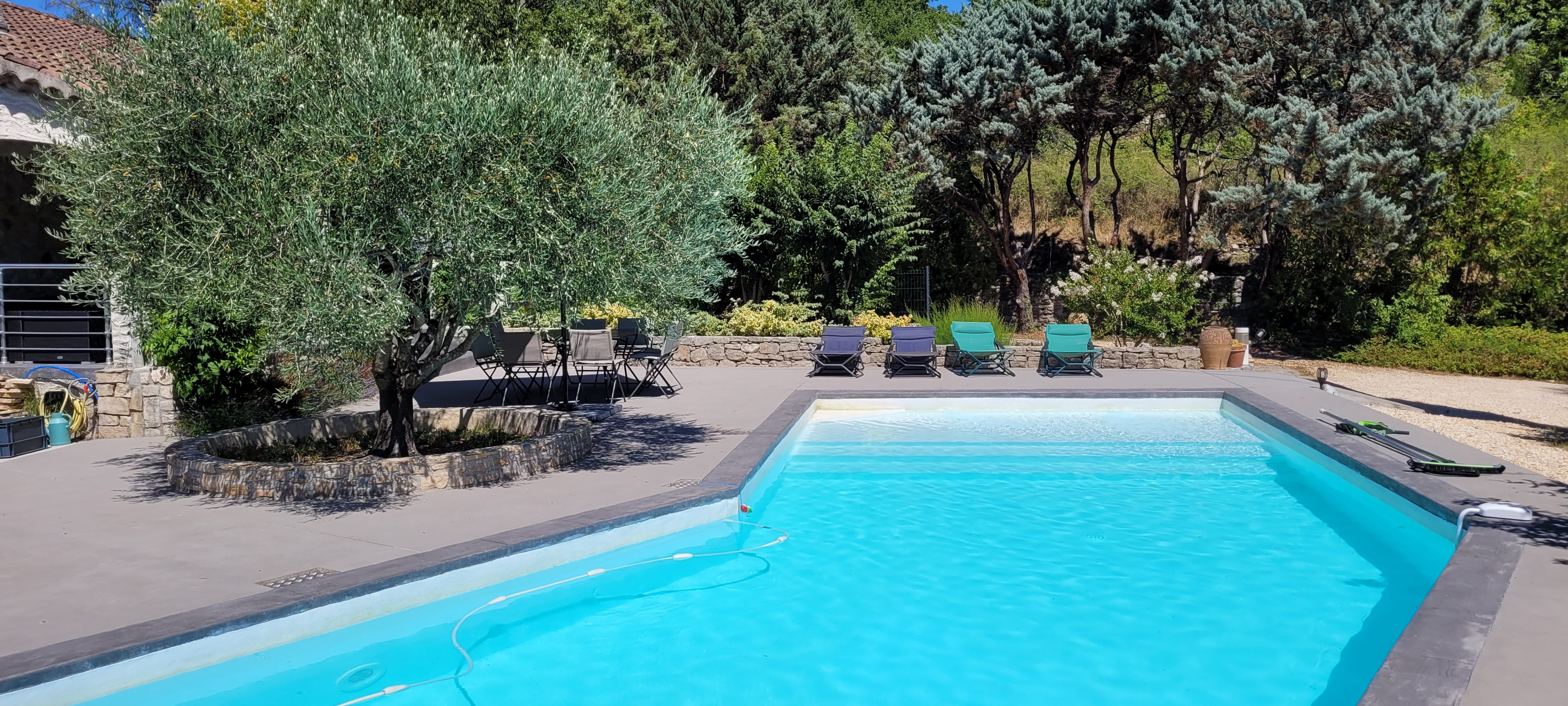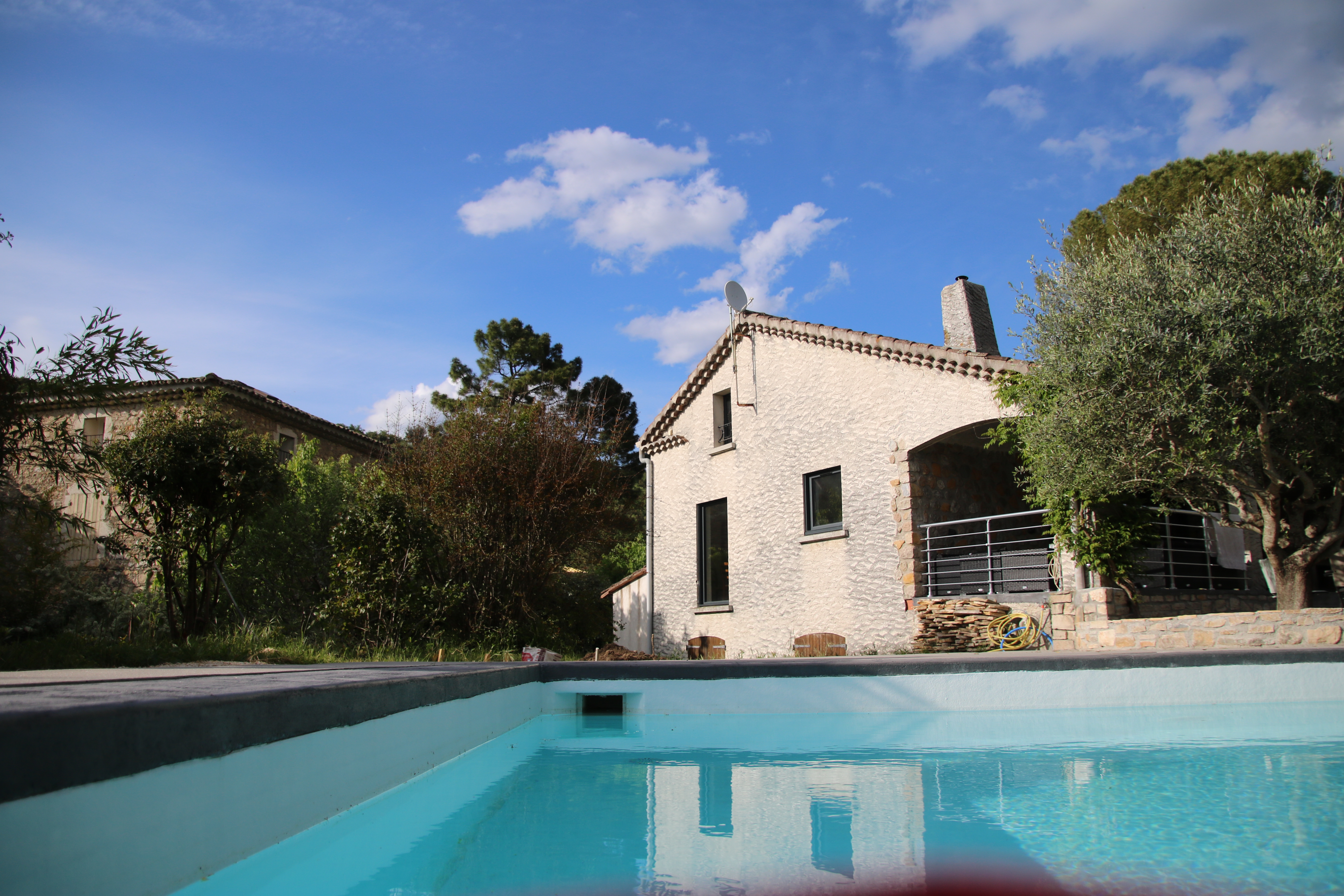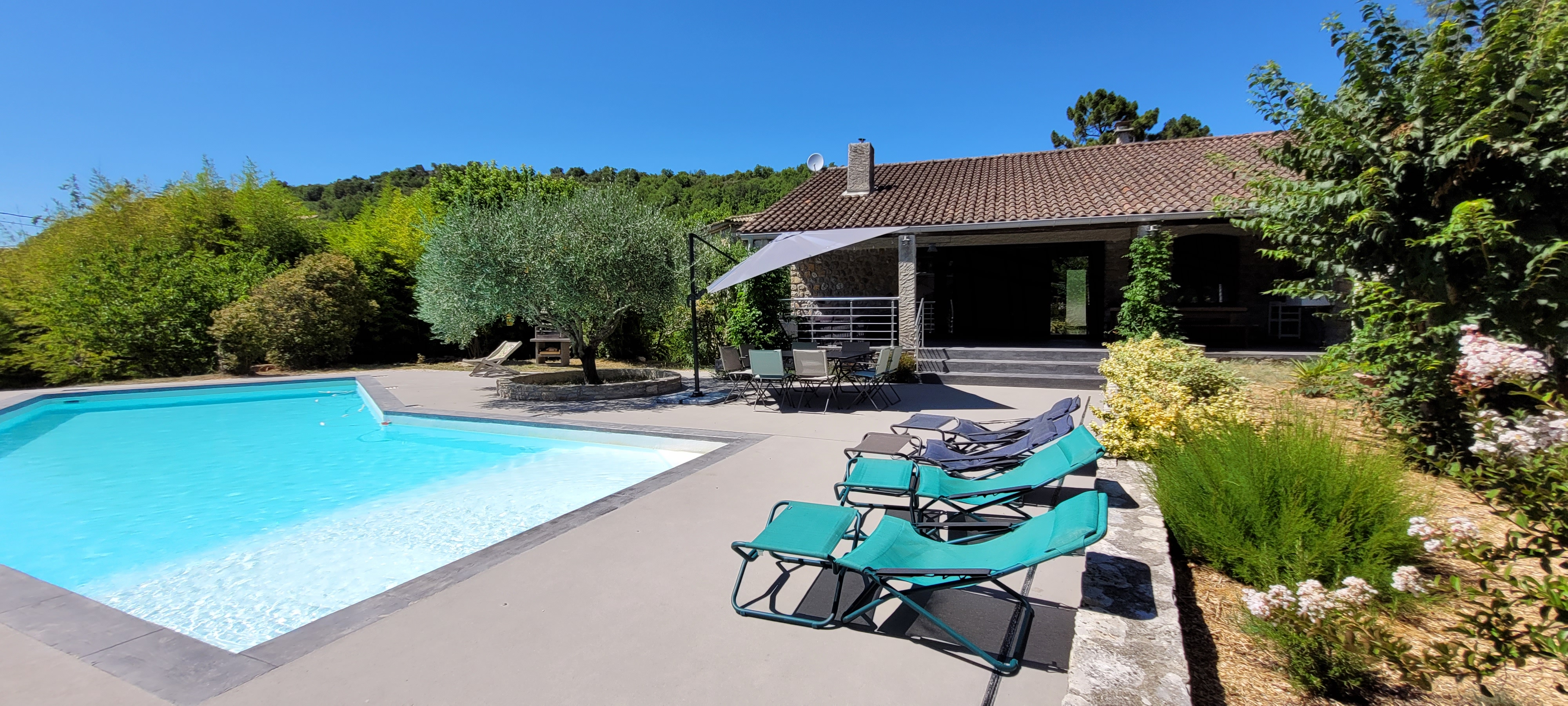 Une terrasse couverte de 35m² comprenant: -un salon de jardin de 10 places -un table et 2 bancs pour 10 convives sous un ventilateur pour recevoir vos amis. Une grande piscine de 4,5m X 12m avec un traitement au sel pour un maximum de confort. Une alarme de piscine conforme à la réglementation. Une magnifique plage de piscine de 110m² -avec 2 tables et 8 chaises pour vos petits déjeuners ou repas en soirée -5 transats. Un barbecue. Un terrain de pétanque avec les boules à disposition. Un abris à voiture pour 2 véhicules. Un étendoir à linge et un composteur.