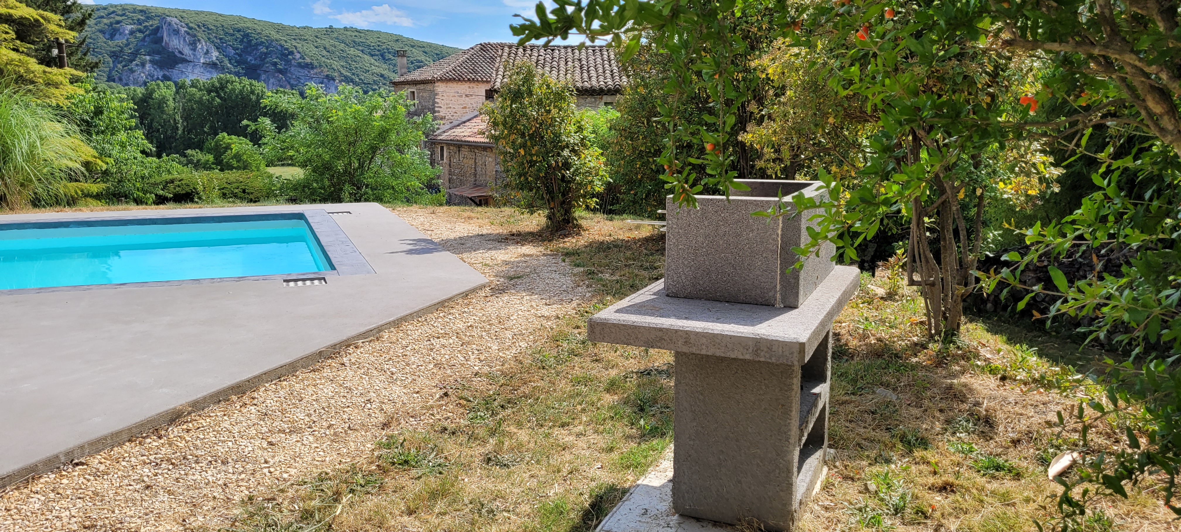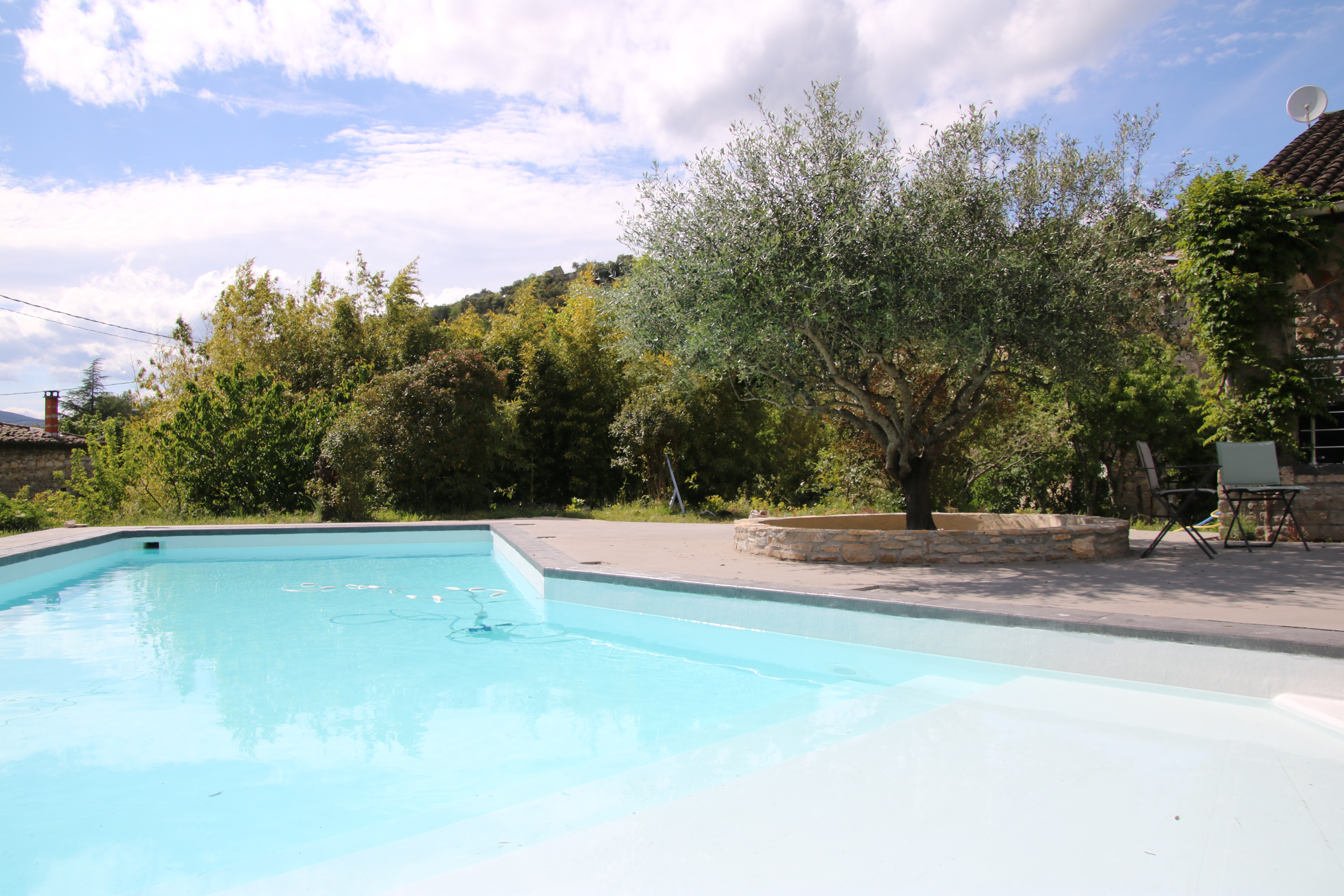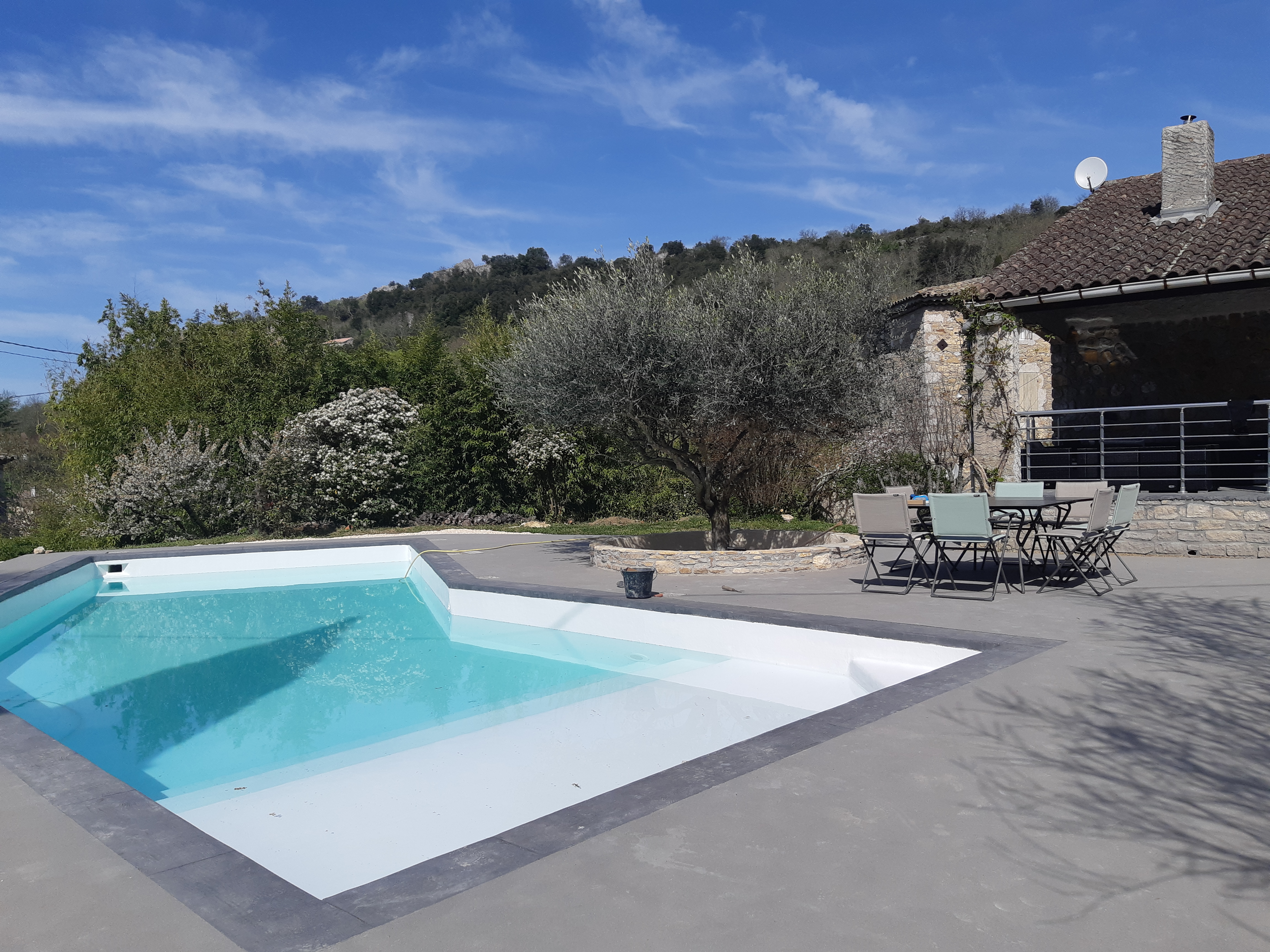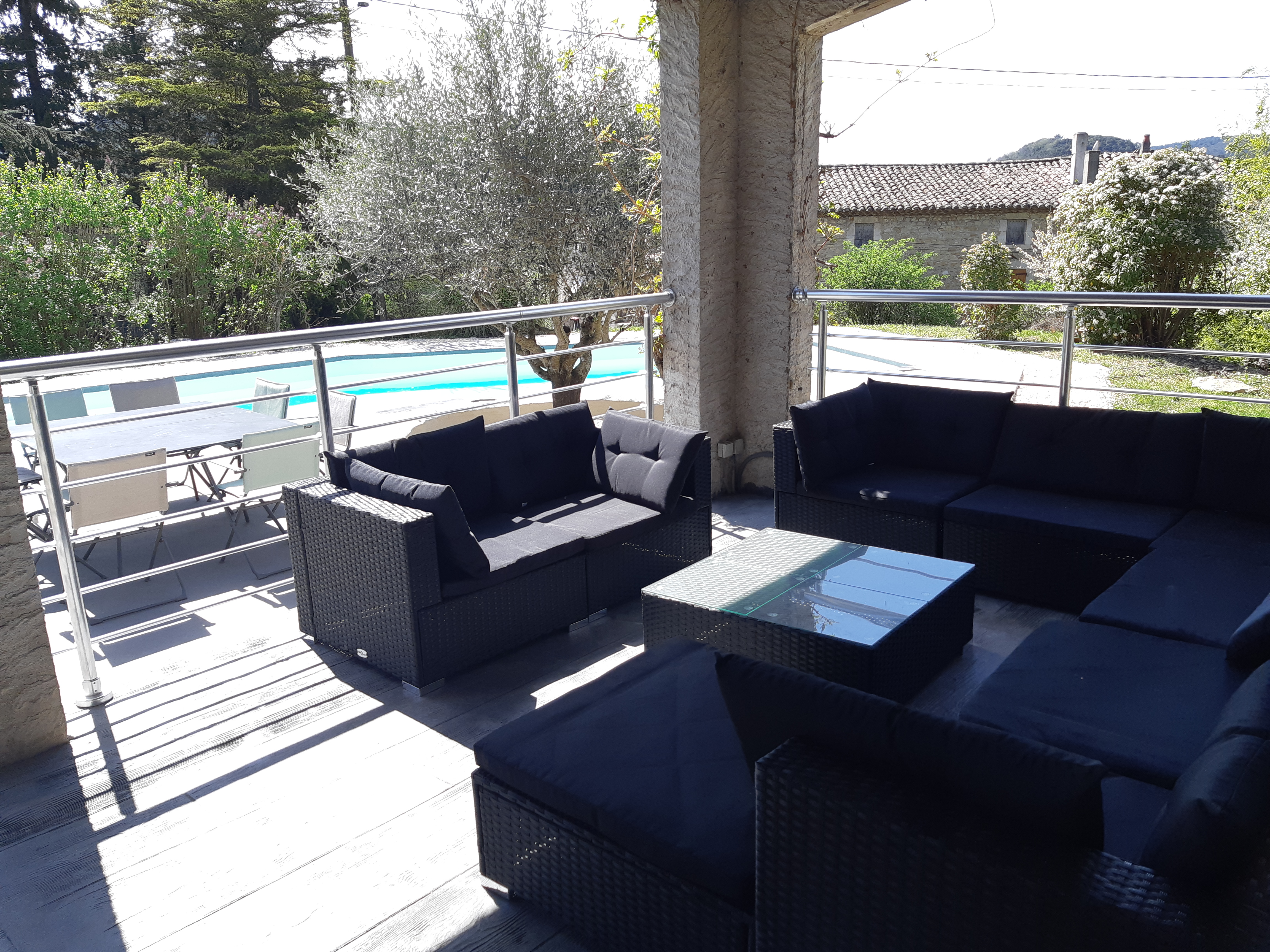 Une terrasse couverte de 35m² comprenant: -un salon de jardin de 10 places -un table et 2 bancs pour 10 convives sous un ventilateur pour recevoir vos amis. Une grande piscine de 4,5m X 12m avec un traitement au sel pour un maximum de confort. Une alarme de piscine conforme à la réglementation. Une magnifique plage de piscine de 110m² -avec 2 tables et 8 chaises pour vos petits déjeuners ou repas en soirée -5 transats. Un barbecue. Un terrain de pétanque avec les boules à disposition. Un abris à voiture pour 2 véhicules. Un étendoir à linge et un composteur.